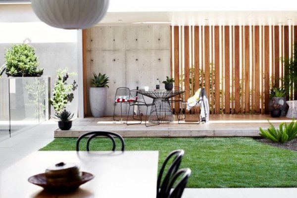 Sử dụng sàn gỗ giật cấp và thêm bộ bàn ghế chủ nhà có một khu vực ăn uống ngoài trời thật lý tưởng.