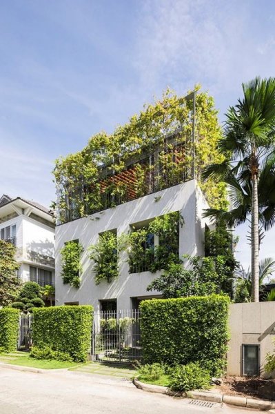 Mặt tiền của ngôi nhà được bao phủ bởi những cây thường xuân, mang đến vẻ đẹp lạ mắt và vô cùng gần gũi với thiên nhiên. Thiết kế này sẽ giúp làm dịu đi ánh nắng gay gắt của vùng nhiệt đới và giúp điều hòa không khí tốt hơn.