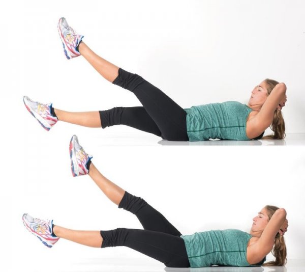 - Bước 2: Hai đầu gối hơi gập và nâng hai chân lên, sau đó thực hiện liên tục động tác vắt chéo 2 chân trên không. Tập nhịp nhàng, đều đặn trong khoảng 45 giây.