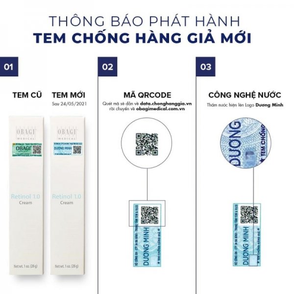 Một cách phân biệt Retinol Obagi thật giả để người dùng sử dụng đó là thông qua tem chống hàng giả. Trước hết, phải khẳng định rằng tại Việt Nam hiện nay chỉ có công ty Xuất Nhập Khẩu Dương Minh là đơn vị duy nhất đại diện cho hãng Obagi Medical và được nhập khẩu cũng như phân phối độc quyền sản phẩm Obagi. Vì thế, khi mua sản phẩm, chúng ta cần kiểm tra đầy đủ niêm phong, tem phụ tiếng Việt và tem chống hàng giả trên sản phẩm.