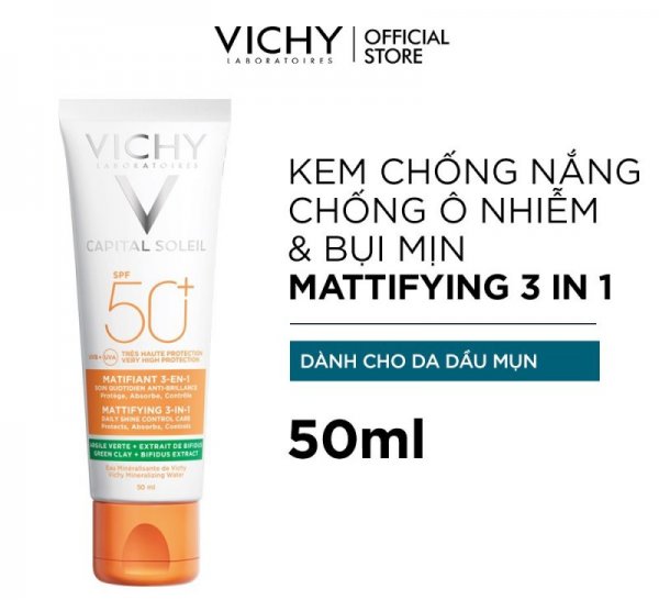 Kem chống nắng Vichy Capital Soleil Anti-Ageing 3-in-1 phù hợp cho mọi làn da. (ảnh: shopee.vn).Kem chống nắng Vichy SPF50+ chống ô nhiễm, bụi mịn và căng mượt da Capital Soleil Mattifying 3-in-1