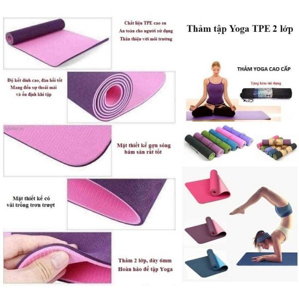 - Chất liệu thảm yoga phổ biến hiện nay là PVC (Polyvinyl chloride) và TPE (Thermoplastic Elastomer). Thảm TPE được làm từ chất liệu cao su non với nhiều ưu điểm và lợi thế hơn so với thảm PVC.
