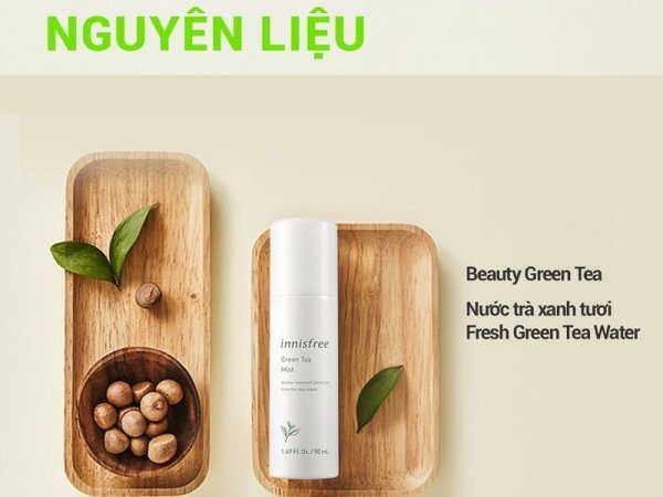 Xịt khoáng Innisfree trà xanh (Nguồn: Shopee.vn)- Chiết xuất mầm và lá trà xanh tươi Fresh Green Tea Water: được sàng lọc từ hơn 2,401 giống trà xanh Hàn Quốc giúp dưỡng ẩm, chống lão hóa chuyên sâu.