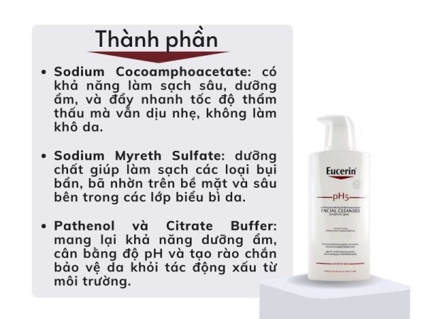 Độ PH của sữa rửa mặt Eucerin pH5 Facial Cleanser Sensitive Skin luôn cân bằng ở mức 5.0 nên có độ lành tính cao và không gây kích ứng da. Các thành phần nổi bật của sản phẩm bao gồm: