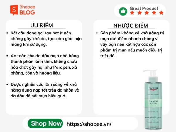 Ưu và nhược điểm của Eucerin Pro Acne Solution Cleansing Gel (Nguồn: Shopee Blog)Đánh giá sản phẩm