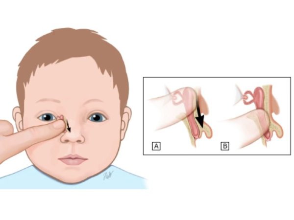 - Bước 1: Bạn ấn ngón tay trỏ vào sống mũi bên cạnh tuyến lệ của trẻ.