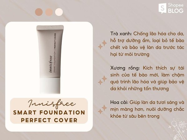 Một số thành phần chính của kem nền Innisfree (Nguồn: Shopee Blog)Với bảng thành phần này, công dụng chính của dòng kem nền cho da khô của Innisfree là: