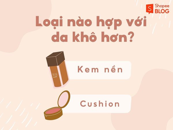 Da khô nên dùng cushion hay kem nền? (Nguồn: Shopee Blog)Da khô nên dùng kem nền hay cushion sẽ phụ thuộc vào tình trạng da của bạn. Nếu làn da của bạn thuộc tuýp da khô nhưng có nhiều khuyết điểm như mụn nhỏ li ti, thâm nám, sạm,… việc sử dụng kem nền sẽ giúp bạn che phủ khuyết điểm tối ưu hơn. Tuy nhiên, nếu làn da của bạn thuộc dạng da khô căng quá mức, khó bám lớp trang điểm, việc sử dụng cushion sẽ tốt hơn vì các sản phẩm cushion thường giàu dưỡng chất cấp ẩm, tăng cường độ mượt mà và thẩm thấu cho da.