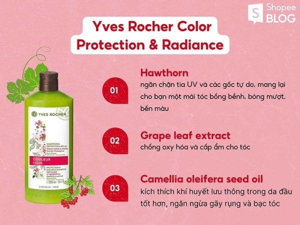 Một số thành phần nổi bật và công dụng của dầu gội Yves Rocher (Nguồn: Shopee Blog)Công dụng của dầu gội giữ màu tóc Yves Rocher là: