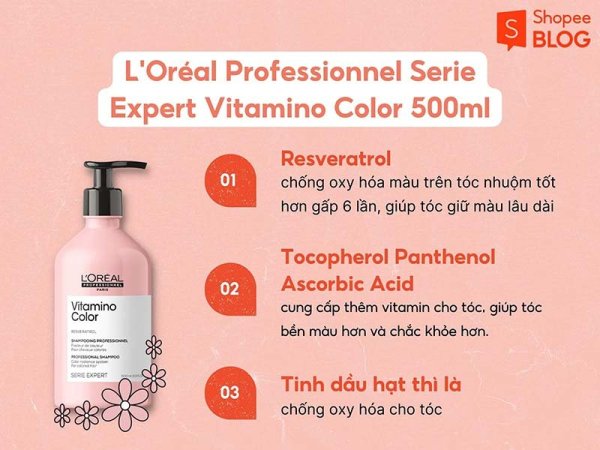 Thành phần của dầu gội L’Oréal Professionnel Serie Expert Vitamino Color (Nguồn: Shopee Blog)Công dụng của sản phẩm có thể kể đến như sau: