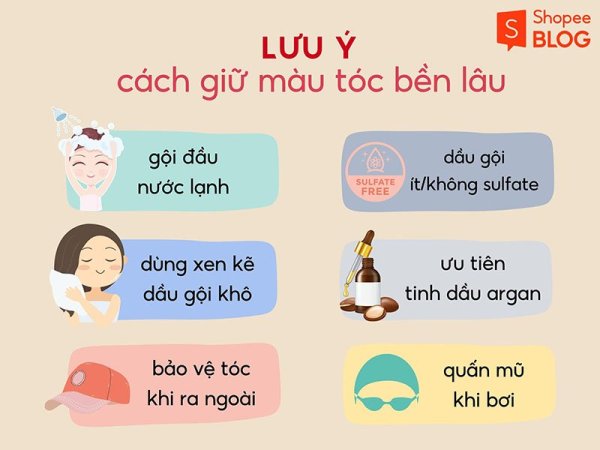 Bên cạnh đó, màu tóc nhuộm có thể giữ được lâu dài hay không còn phụ thuộc vào các vấn đề sinh hoạt hàng ngày. Bạn nên lưu ý bảo vệ mái tóc kỹ càng khi ra nắng hoặc khi tham gia các hoạt động ngoài trời, dưới nước. Đừng quên theo dõi Shopee Blog để cập nhật thêm nhiều mẹo chăm sóc tóc và sắc đẹp hữu ích.