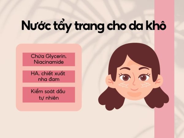 Nguyên nhân khiến cho làn da khô và bong tróc là do thiếu các dưỡng chất làm ẩm hoặc thiếu dầu. Khi lựa chọn nước tẩy trang cho da khô, bạn nên tìm kiếm các sản phẩm chứa thành phần dịu nhẹ và có khả năng cung cấp độ ẩm cho da như Glycerin, Niacinamide, Hyaluronic Acid hoặc nha đam. Tránh lựa chọn loại tẩy trang có chứa dầu nặng hoặc chất làm tắc nghẽn lỗ chân lông.