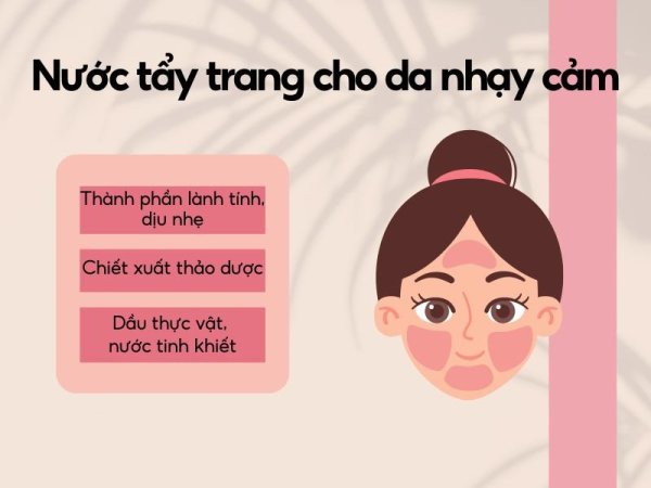 Nếu bạn thuộc làn da nhạy cảm thì bạn phải thật cẩn thận khi lựa chọn sản phẩm chăm sóc da mặt hàng ngày. Da nhạy cảm rất dễ bị kích ứng với các tác nhân bên ngoài như bụi bẩn, ánh nắng hay mỹ phẩm không phù hợp. Do đó, bạn nên lựa chọn nước tẩy trang có thành phần lành tính, an toàn và dịu nhẹ cho làn da như chiết xuất từ thảo dược, dầu thực vật, hoa quả hoặc nước tinh khiết. Nên tránh lựa chọn sản phẩm có chứa cồn, hương liệu hoặc paraben sẽ gây kích ứng cho da và hình thành mụn.
