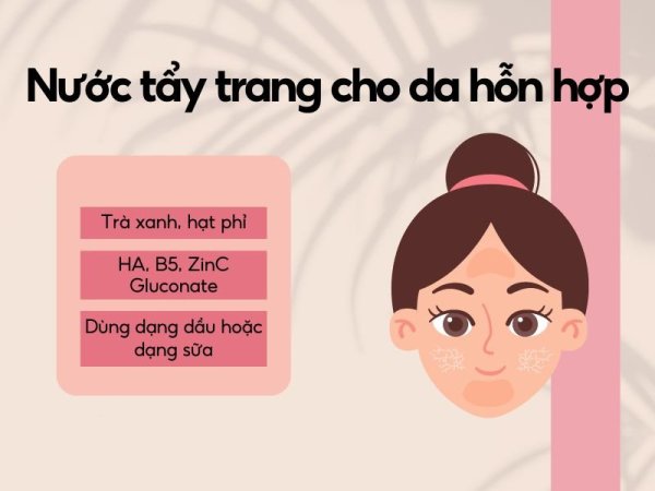 Các thành phần trong nước tẩy trang phù hợp với da hỗn hợp (Nguồn: Shopee Blog)Đối với da hỗn hợp thiên dầu, bạn nên ưu tiên chọn tẩy trang dạng nước micellar water, nếu thường xuyên trang điểm thì bạn có thể chọn dạng dầu hoặc sữa để làm sạch tốt hơn. Bên cạnh đó, bạn cũng ưu tiên lựa chọn sản phẩm có thành phần chống viêm, kháng khuẩn và tẩy tế bào chết dịu nhẹ như trà xanh, hạt phỉ, citric acid,… hoặc các thành phần dưỡng ẩm như Glycerin, ZinC Gluconate, ZinC Pca,… sẽ là lựa chọn nước tẩy trang hoàn hảo cho da hỗn hợp thiên dầu.
