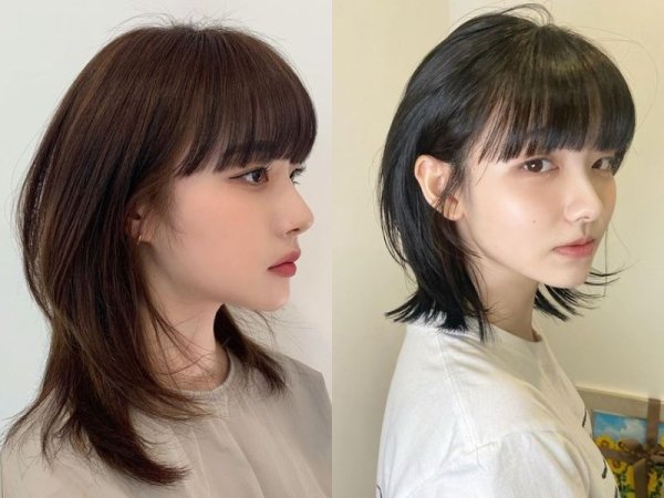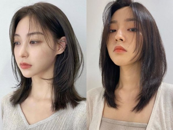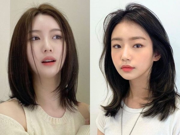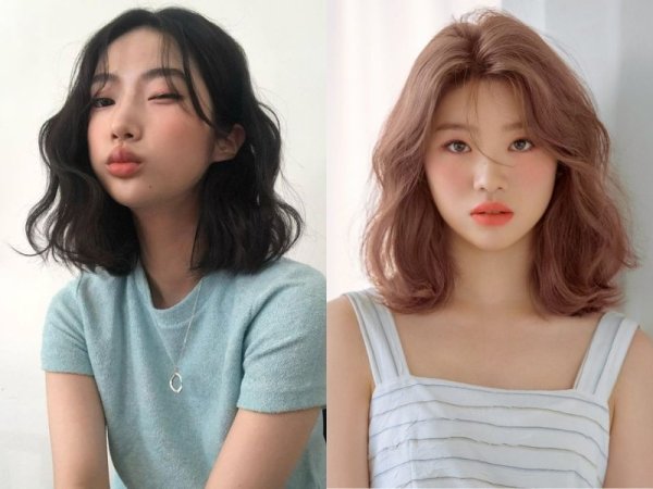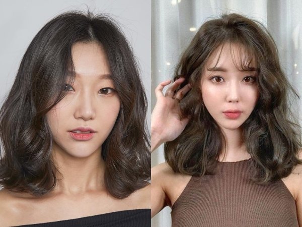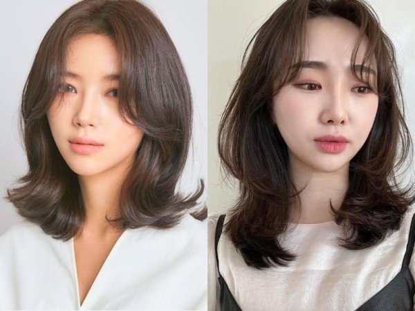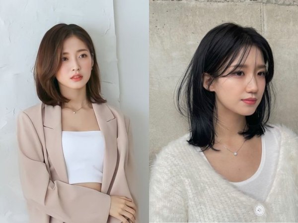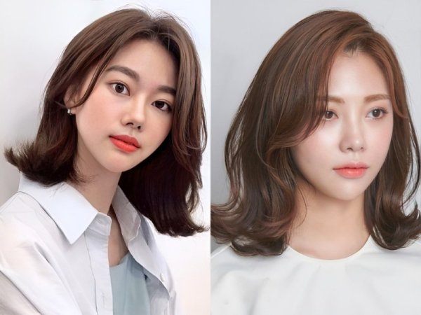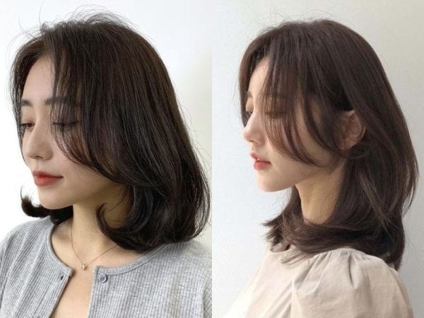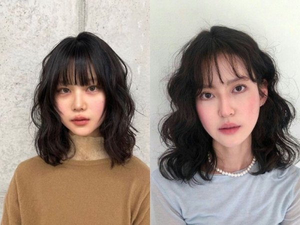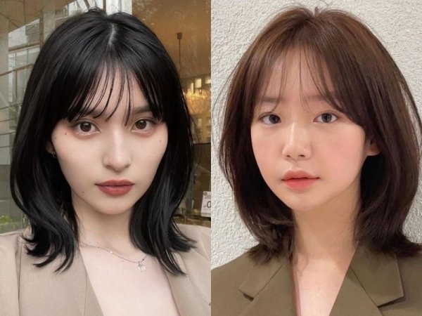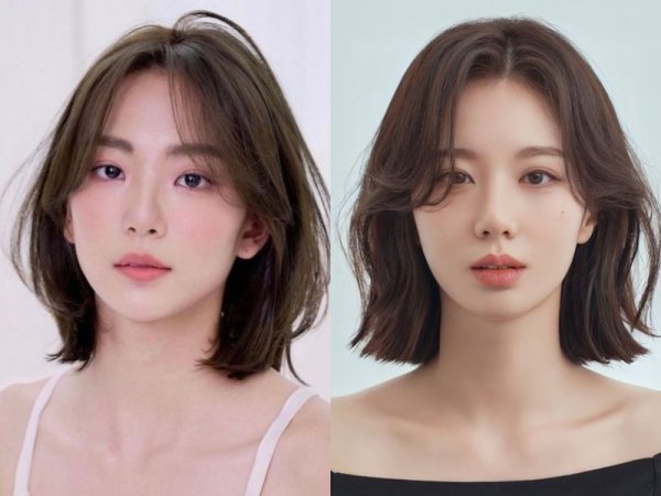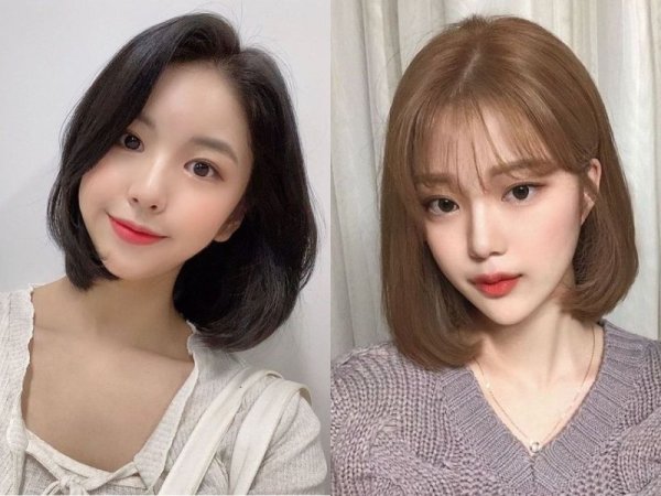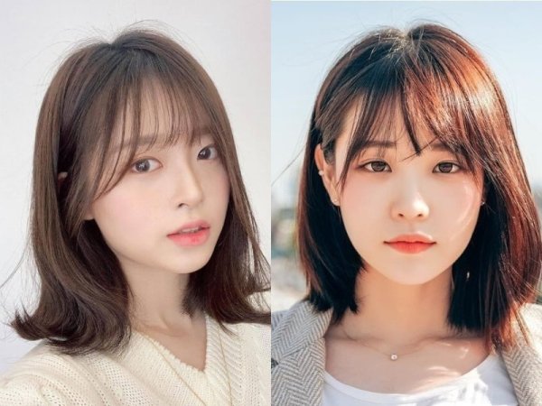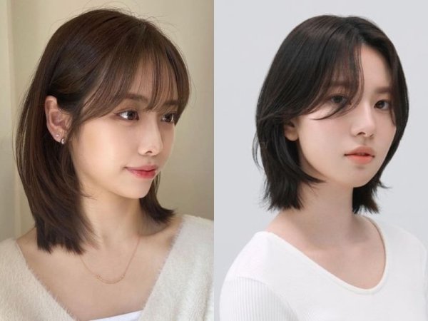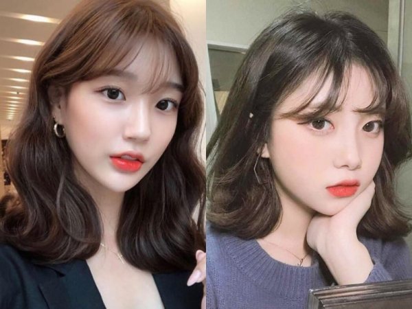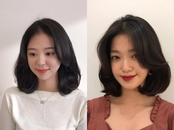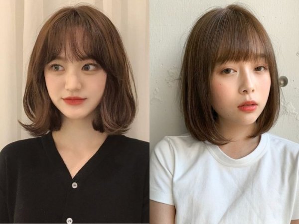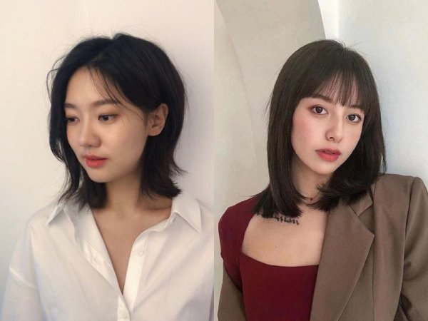 Tóc uốn ngang vai chữ C mang phong cách cổ điển (Nguồn: 하움 – Pinterest, ReviewNao – Pinterest) Kiểu tóc này có thể kết hợp với mái thưa hoặc mái bay đều phù hợp (Nguồn: chahong và 하움 – Pinterest)Tóc ngang vai uốn đuôi vểnh