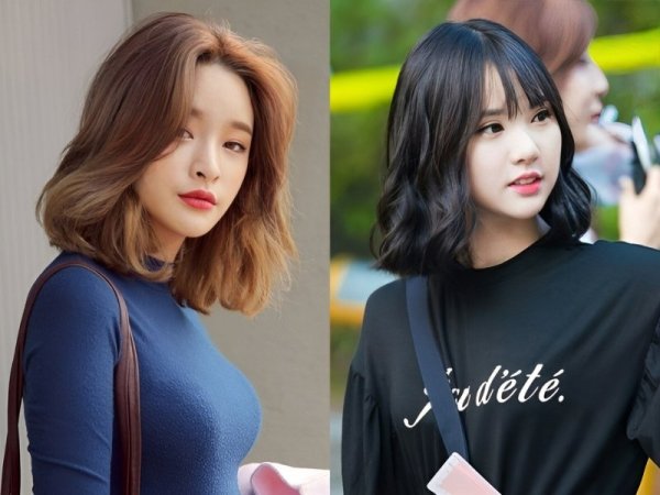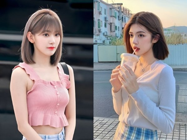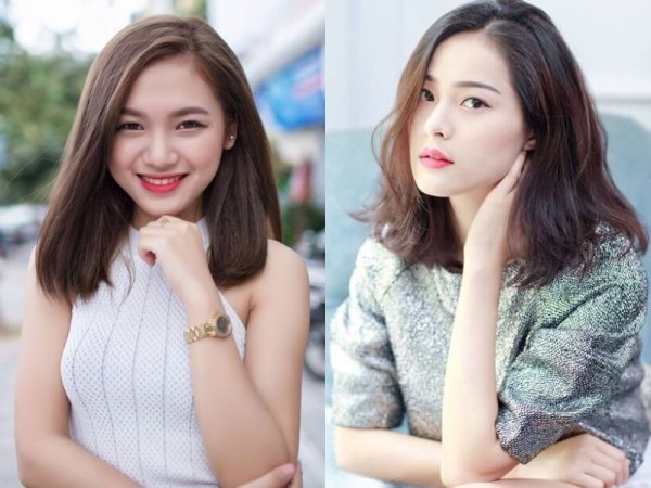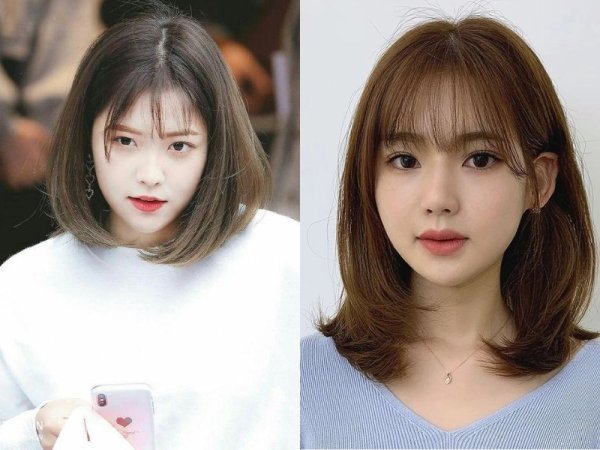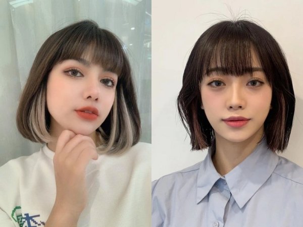 Tóc ngang vai mái thưa giúp che đi xương hàm góc cạnh (Nguồn: Yeri Cherry, Tóc đẹp 365) Các bạn mặt vuông không nên nhuộm màu quá sáng (Nguồn: Cauvongtinhyeu, Xwatch)Tóc cắt ngang vai mái bằng