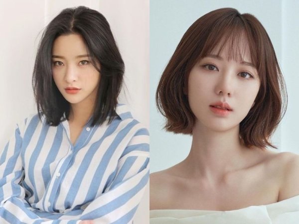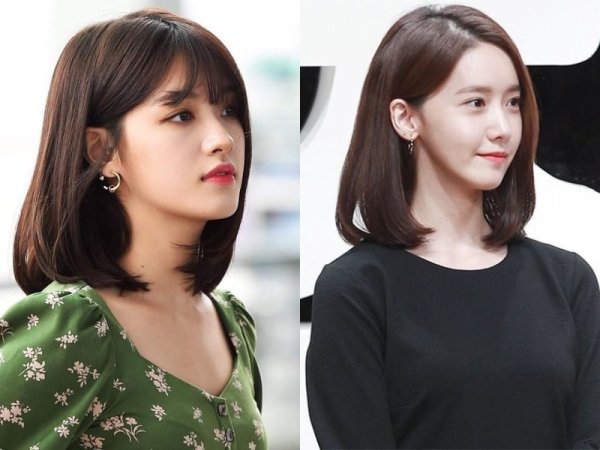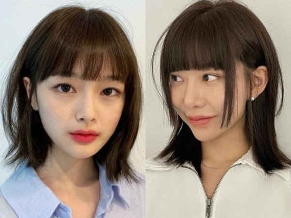 Đối với tóc ngang vai mái bằng, bạn có thể tỉa layer để khuôn mặt trông gọn hơn (Nguồn: 차홍 CHAHONG_OFFICIAL – Pinterest, ceo – Pinterest) Mái bằng giúp tôn lên đôi mắt đẹp (Nguồn: kbeautyaddiction.com và chahong)Tóc cắt ngang vai mái bay