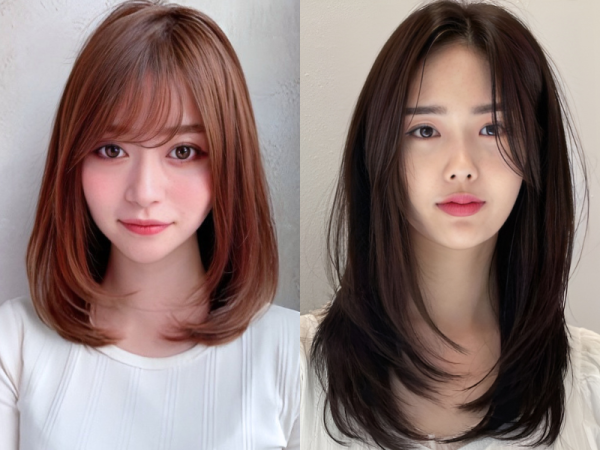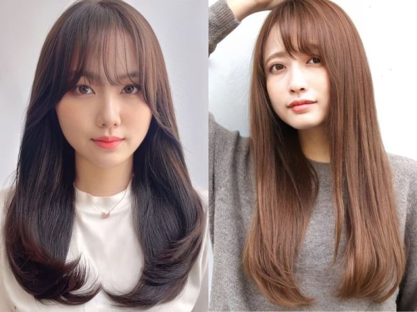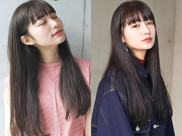Tóc duỗi tự nhiên bóng mượt kết hợp cắt mái bằng hoặc mái thưa là kiểu tóc phù hợp với khuôn mặt dáng dài. Không chỉ giúp tỷ lệ gương mặt trở nên cân đối hơn, kiểu tóc này còn có khả năng “hack tuổi” và mang lại vẻ đẹp thuần khiết cho diện mạo của bạn.
