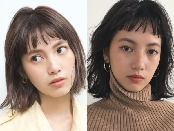 Tóc mái ngố cắt xéo là kiểu tóc mái ngố nữ mặt tròn, trán cao (Nguồn: beauty.yahoo.jp/maquia_online) Kiểu tóc cắt kết hợp mái bay hai bên giúp che khuyết điểm tốt (Nguồn: beauty-navi.com/afloat.co.jp)Tóc mái ngố trên lông mày
