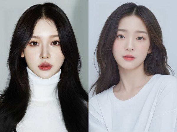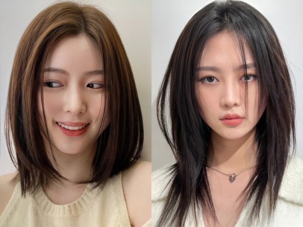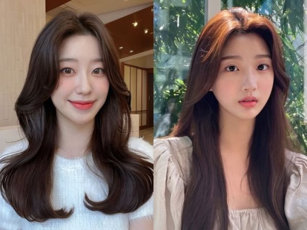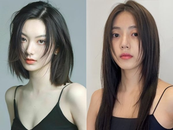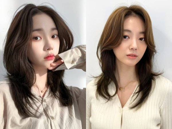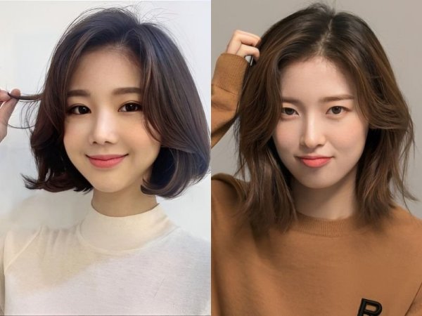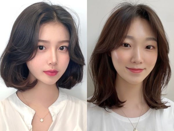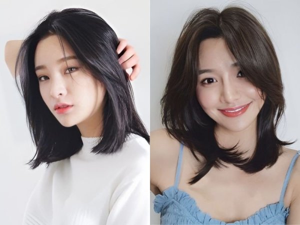 Tóc hai mái nữ cho mặt dài (Nguồn: kbeautyaddiction.com, chahong.com) Tóc 2 mái che khuyết điểm mặt dài (Nguồn: HAUM, Chica)Tóc hai mái nữ cho mặt vuông