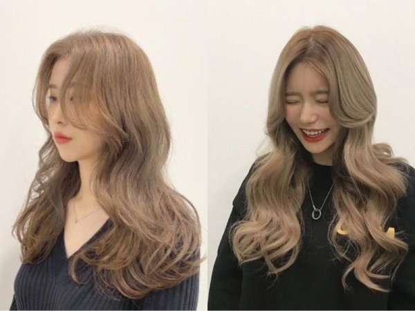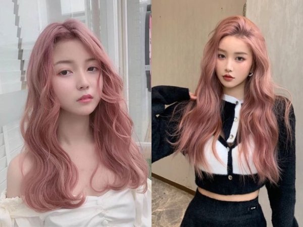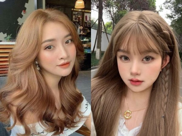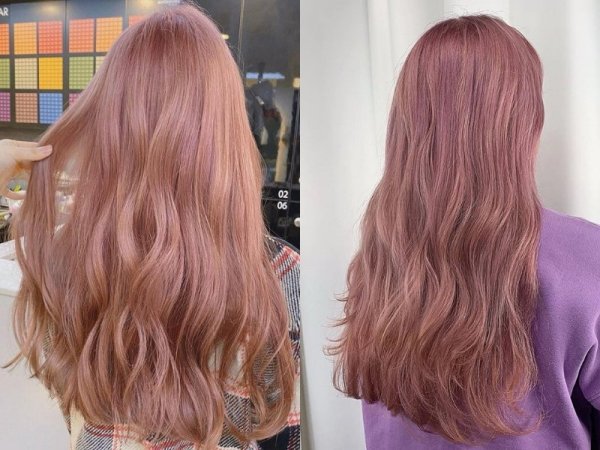 Màu nâu trà sữa pha hồng hợp với tone da trắng (Nguồn: VOH – Pinterest, douyin.com) Màu tóc này khá nhanh phai, nên sử dụng dầu gội tím (Nguồn: Cconte, aFamily)Màu xanh đen