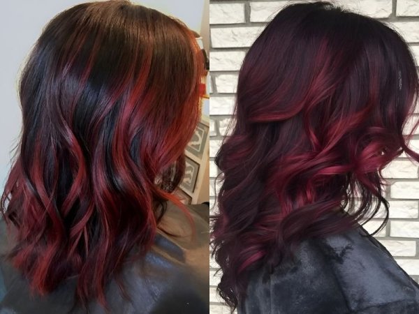 Nhuộm đỏ rượu vang kết hợp màu đen (Nguồn: latest-hairstyles.com) Tóc đỏ rượu sáng kết hợp màu đen (Nguồn: chelsea, stayglam.com)Tóc màu đỏ rượu pha ánh nâu