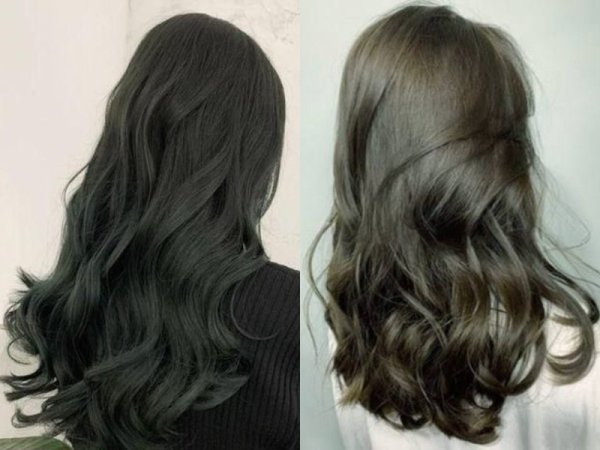 Màu tóc xanh rêu nâu phù hợp với tone da ấm (Nguồn: Dep365, hair.cm) Bạn có thể uốn xoăn để tóc bồng bềnh và nổi bật hơn (Nguồn: e – Pinterest, Baeki Hyoon -Pinterest)Tóc xanh rêu nhạt