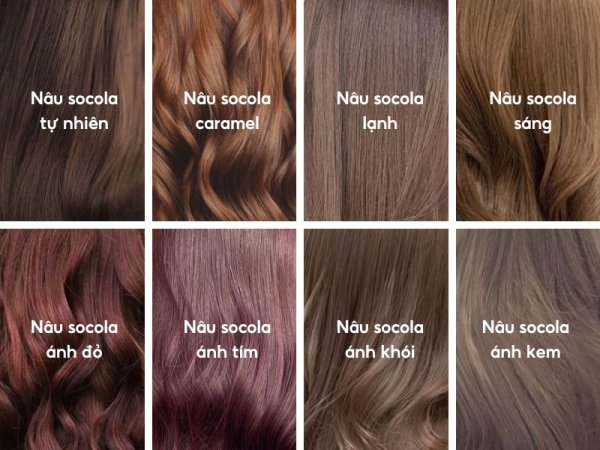 Nâu socola là một màu nhuộm nâu cơ bản mang vẻ đẹp tự nhiên nhưng không kém phần ấn tượng. Bảng màu nâu socola cũng rất đa dạng, từ màu socola thuần đen đến nâu socola sáng có phần rực rỡ hơn. Ngoài ra, màu tóc này còn có thể kết hợp với các sắc độ vàng, tím, đỏ để mái tóc thêm phần độc đáo.
