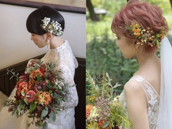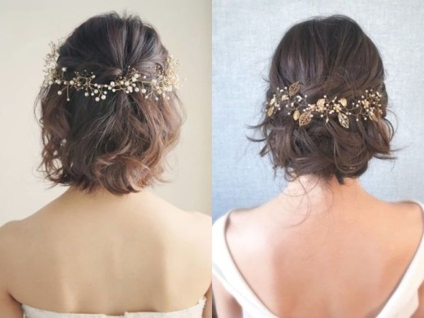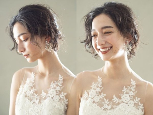 Cô dâu tóc ngắn vẫn vô cùng xinh đẹp với phần tóc uốn xoăn nhẹ kết hợp các phụ kiện cài tóc tinh tế (Nguồn: chomco.hairmak/jweddingnews.jp) Tạo kiểu tóc cô dâu ngắn uốn xoăn nhẹ sẽ giúp mái tóc có độ bồng bềnh hơn (Nguồn: search.yahoo.co.jp)Kiểu tóc cho cô dâu ngang vai cho nàng mặt tròn