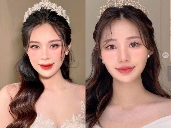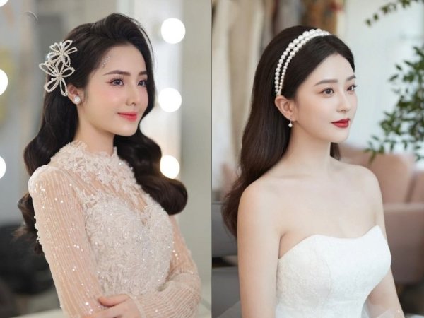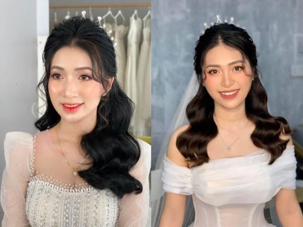 Đây cũng là kiểu tóc khá đơn giản, phù hợp với nhiều kiểu gương mặt nhưng không kém phần nổi bật cho các nàng dâu. Phần tóc được buộc gọn sẽ được tạo kiểu đánh phồng chân tóc giúp gương mặt nhỏ gọn, thanh tú hơn. Phần tóc xõa thường được uốn gợn sóng, tạo nên sự nổi bật và vẻ đẹp sang trọng cho cô dâu. Kiểu tóc này phù hợp với cả kiểu váy cưới trắng và áo dài cưới truyền thống Việt Nam.