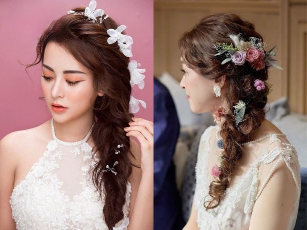 Kiểu tóc cô dâu cài hoa là một trong những xu hướng hot nhất hiện nay được rất nhiều nàng dâu lựa chọn. Những nhành hoa tươi được cài và đính lên tóc giúp các nàng thêm duyên dáng và dịu dàng trong ngày cưới.