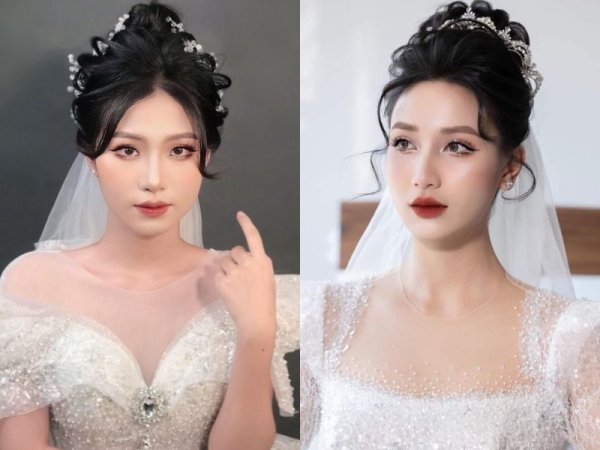 Kiểu tóc cô dâu búi cao có mái bay sang trọng, nữ tính (Nguồn: azwedding.vn/linhnga.vn) Tóc búi cao đánh rối kết hợp cài voan sẽ giúp cô dâu vô cùng nổi bật trong ngày cưới (Nguồn: Ngoc Diu Makeup Artist/Hang Thu Makeup Artist)Kiểu tóc cô dâu búi thấp