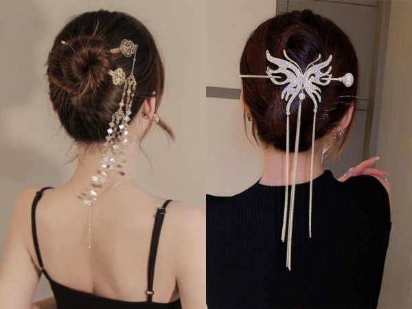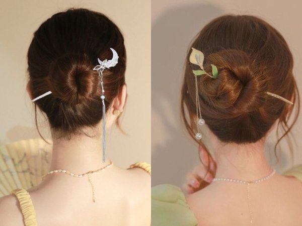 Nếu bạn muốn tạo thêm điểm nhấn mới mẻ cho kiểu tóc búi thì hãy thử chọn kết hợp thêm trâm cài tóc nhé. Kiểu tóc cài trâm được búi tròn ở giữa tạo nên tổng thể cân đối và vẻ đẹp quý phái, nữ tính. Đặc biệt những chiếc trâm cài lấp lánh sẽ giúp tôn lên những trang phục cổ điển, thanh lịch.