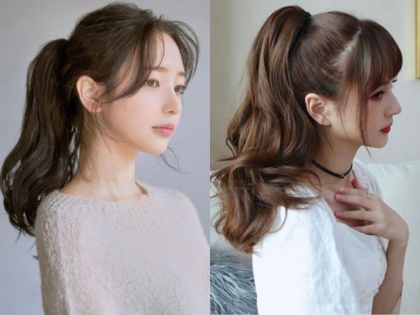 Mái bay kết hợp với mái tóc uốn xoăn dài sẽ giúp khuôn mặt thêm thanh thoát (Nguồn: Aube, CHAHONG) Bạn cần điều chỉnh độ dài mái bay tùy theo khuôn mặt của mình (Nguồn: CHAHONG)Tóc xoăn sóng buộc cao