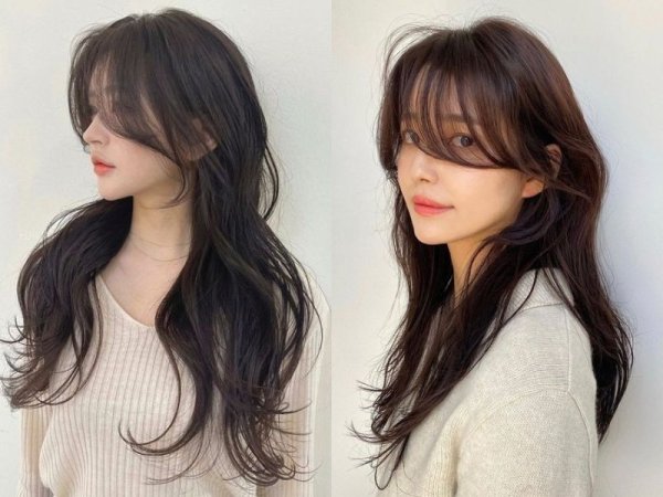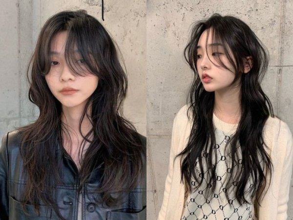 Mái thưa mỏng nhẹ giúp gương mặt thêm thanh thoát (Nguồn: ashleybongy – Pinterest và chahong – Pinterest) Tóc uốn gợn sóng mái thưa phù hợp với mọi outfit thời trang (Nguồn: Korean style)Tóc uốn gợn sóng mái bằng