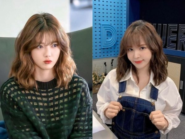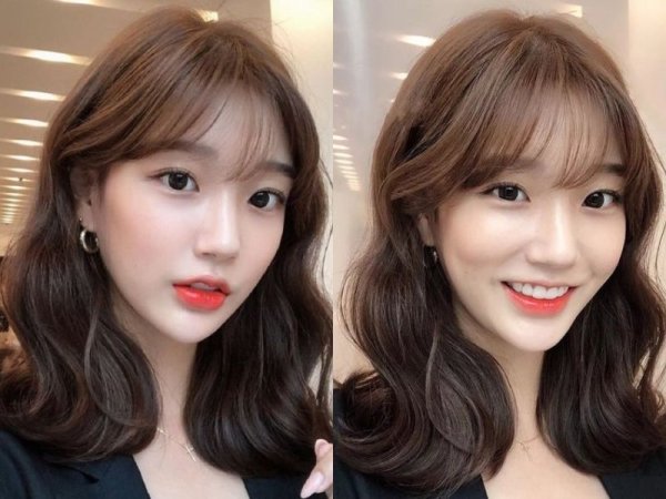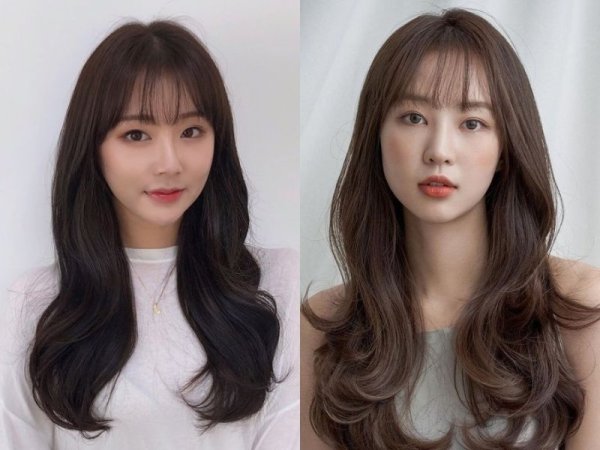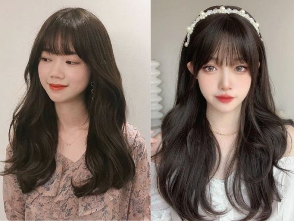 Tóc mái bằng phủ xuống che phần khuyết điểm trán (Nguồn: 하움 – Pinterest) Trán cao không còn là nỗi lo ngại khi sở hữu kiểu tóc uốn sóng mái bằng (Nguồn: IloveKpop Instagram)Tóc uốn gợn sóng lọn to cho mặt tròn
