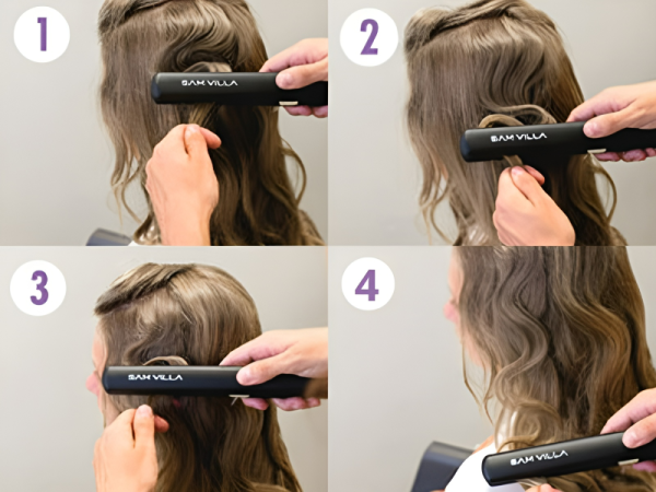 - Bước 2: Bạn thực hiện kéo tóc theo tạo hình chữ S. Trong mỗi giai đoạn kéo, bạn nên nhớ để yên khoảng 10 giây để tóc vào nếp cong.