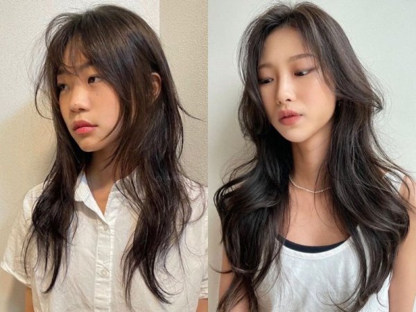 Mái dài cũng rất phù hợp với tóc dài layer (Nguồn: CHAHONG, Nisa – Pinterest) Mẫu tóc này khiến mái tóc của bạn sẽ thêm bồng bềnh hơn (Nguồn: e – Pinterest, CHAHONG)Tóc dài layer mái 6/4