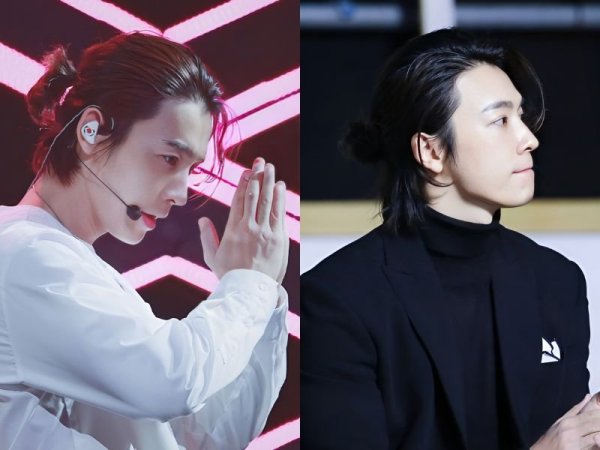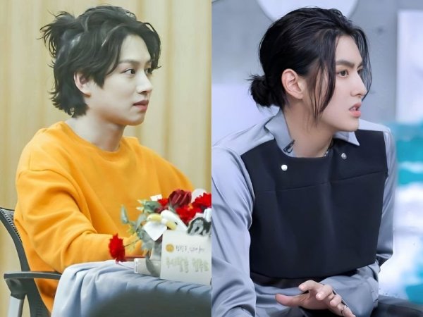 Man bun để mái (Nguồn: Weibo mmiao, Weibo Hứa Khải) Man bun mặt tròn (Nguồn: Hwang Hyunjin Fanpic, Wooyong Twitter)Tóc man bun buộc nửa