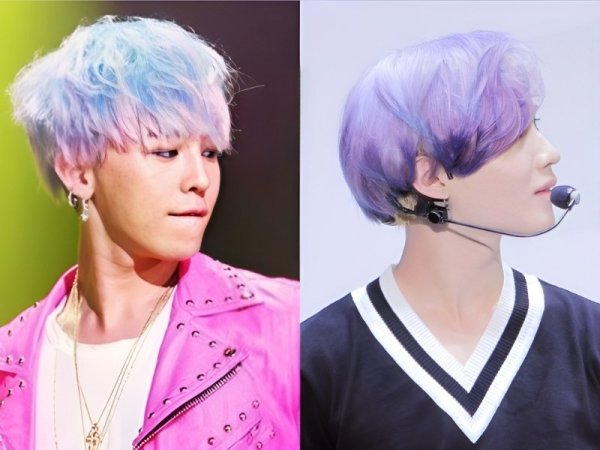 Nhuộm tóc màu tím khói phối hợp với tone hồng là một lựa chọn được nhiều người ưa chuộng (Nguồn: Monopoly, @BTS_FACTS – X) Mẫu tóc này còn giúp tôn da một cách hiệu quả, đặc biệt phù hợp với những người có làn da trắng (Nguồn: fyeahbangtaned.tumblr.com, Tinker Bell – Pinterest)Màu tóc nam tím khói ánh xanh