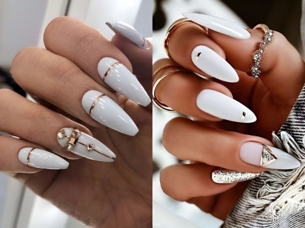 Nail màu trắng luôn mang đến cho bạn sự sang trọng, thuần khiết. Đây cũng là mẫu nail được nhiều cô gái lựa chọn trong ngày cưới trọng đại của mình. Để trở nên thật nổi bật, lộng lẫy, bạn có thể lựa chọn kiểu nail màu trắng đính đá hoặc phụ kiện có tông màu vàng, bạc,… Ngược lại, nếu theo đuổi phong cách năng động thường ngày, bạn có thể lựa chọn kiểu nail trắng kết hợp vẽ họa tiết kẻ sọc, lượn vằn,… đơn giản, thanh lịch.