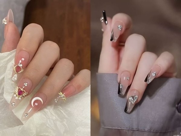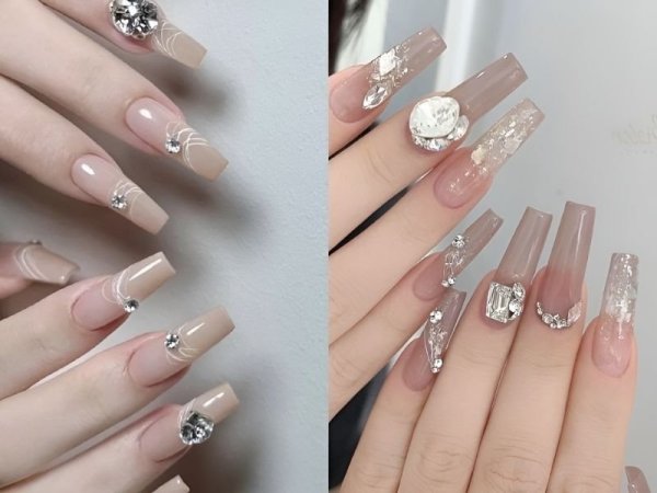 Những mẫu nail móng dài đính đá cầu kỳ, sang trọng luôn mang một sức hút lớn với các chị em phái đẹp. Việc đính kết khéo léo các viên đá, phụ kiện long lanh sẽ giúp cho bộ nail của bạn trở nên đẹp mắt, nổi bật hơn bao giờ hết. Móng dài cũng là dáng móng tay rất phù hợp với kiểu nail này bởi chúng có đủ diện tích để đính phụ kiện, đồng thời tạo hiệu ứng giúp ngón tay trông thon gọn và thanh thoát hơn.
