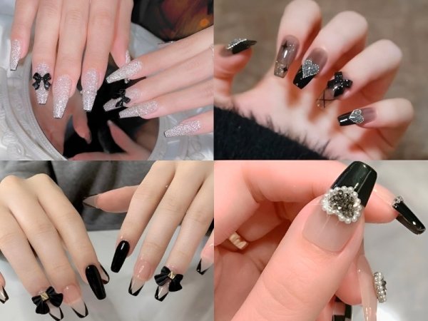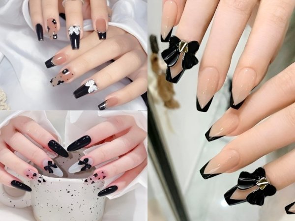 Nail đính nơ đen sang chảnh và hiện đại. (Nguồn: Girlythingz – Pinterest) Nail đính nơ đen chanh sả. (Nguồn: Cristina – Pinterest)Nail đính nơ cho học sinh