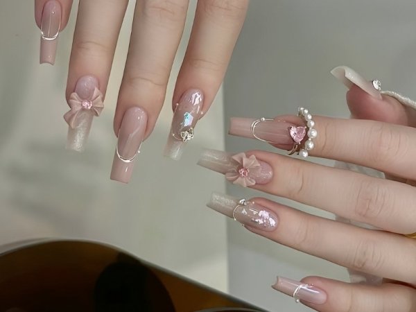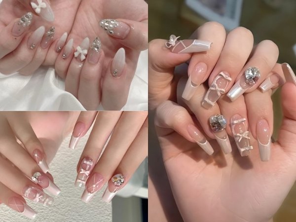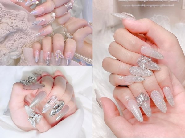 Nail đính nơ lấp lánh mang đến vẻ ngoài dễ thương và nữ tính, làm cho bàn tay trở nên quyến rũ và duyên dáng. Nhờ có charm nơ làm từ kim loại hoặc đá, nhựa, nail đính nơ lấp lánh tạo ra hiệu ứng lung linh, khiến móng tay trở nên nổi bật và thu hút ánh nhìn. Nail đính nơ lấp lánh có thể được kết hợp với nhiều kiểu trang phục và phong cách khác nhau, từ trang phục hằng ngày đến trang phục dự tiệc hay trang phục cô dâu.