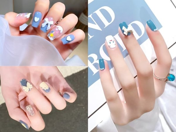 Nail đính nơ xanh hiện đại và bắt mắt. (Nguồn: velvet – Pinterest) Nail đính nơ xanh bắt mắt. (Nguồn: velvet – Pinterest)Nail đính nơ tím mộng mơ
