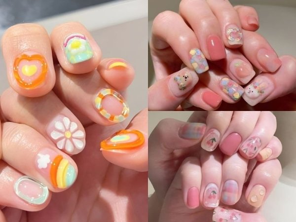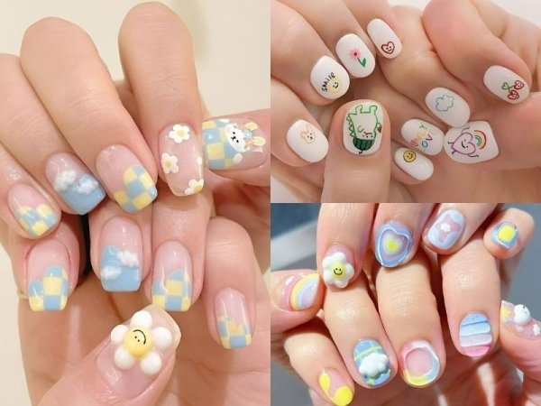 Mẫu nail dễ thương là một lựa chọn hoàn hảo dành cho những cô nàng mang chút trẻ con và năng động. Với mẫu nail này, các nàng có thể lựa chọn những tone màu sắc tươi sáng như xanh dương, vàng, hồng, xanh lá mạ, cam sữa,…. kết hợp cùng một số nét vẽ họa tiết bông hoa hoặc kẻ sọc đơn giản là bạn đã có ngay một kiểu móng tay đẹp rồi đấy!