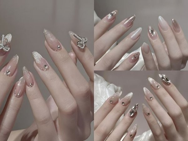 Bên cạnh chiếc váy cưới xinh đẹp thì một bộ nail lộng lẫy cũng được rất nhiều chị em quan tâm. Đối với các mẫu nail đẹp dành cho cô dâu thì bạn có thể lựa chọn tông màu trắng sữa hoặc hồng nhạt nhẹ nhàng. Để tăng thêm sự lấp lánh thì bạn có thể úp móng form tròn hoặc vuông với độ dài vừa phải, đính thêm vài hạt ngọc trai cùng một chút mắt mèo là bạn đã có ngay một bộ nail đẹp và lộng lẫy trong ngày trọng đại của mình rồi đấy! Nếu bạn cần một chút sự cá tính thì có thể lựa chọn form móng nhọn cùng những kiểu đính đá độc đáo hơn, tuy nhiên hạn chế úp móng quá dài sẽ khiến bạn rất bất tiện đấy!
