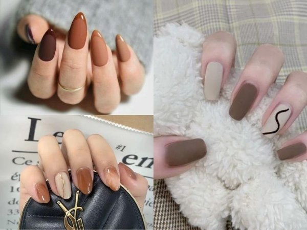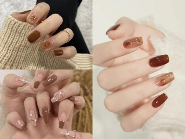 Các mẫu móng tay sơn gel đẹp màu nâu đẹp (Nguồn: voh.com.vn, ebay.com. amazon.com) Nail màu nâu thường phù hợp với tạo kiểu đơn giản, thanh lịch (Nguồn: Moonnnnn_1712 và Linzy – Pinterest)Mẫu nail màu vàng rực rõ