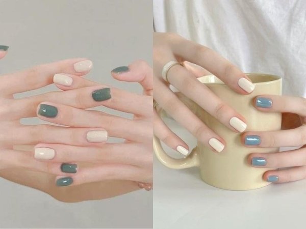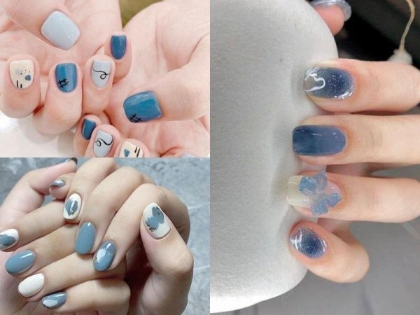 Nail màu xanh dương là mẫu nail tông lạnh có khả năng tôn da cực tốt. (Nguồn: BTS, Cẩm Ngọc, Kiều Trang – Pinterest) Nail xanh dương vẽ họa tiết ấn tượng (Nguồn: Linz, Minzy, và Jolie – Pinterest)Mẫu móng tay màu xanh lá