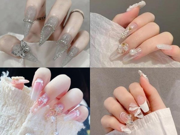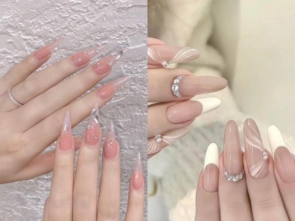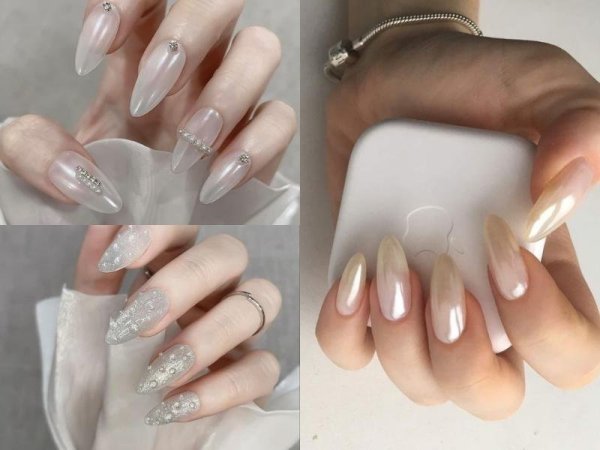 Trong ngày trọng đại của mình, cô dâu có thể chọn những kiểu nail móng dài nhọn nổi bật với những họa tiết đính đá, kim tuyến lấp lánh thu hút ánh nhìn. Tùy vào kiểu dáng váy cưới mà các cô dâu có thể chọn các kiểu nail pastel trùng màu váy hoặc màu trắng, bạc sang trọng. Tuy nhiên, bạn không nên chọn những màu nail quá sặc sỡ, cầu kỳ vì có thể khiến tổng thể thiếu hòa hợp, khó vận động hơn. Bên cạnh đó, trước ngày cưới, bạn nên chăm sóc móng cẩn thận để phần nail chắc chắn hơn cũng như bảo vệ móng của mình nhé.